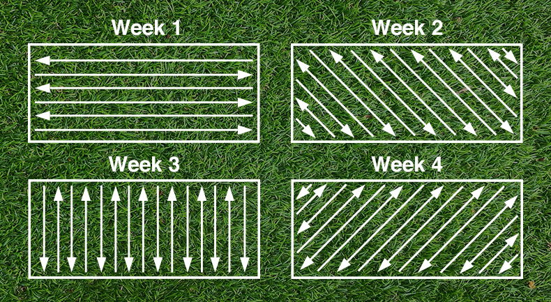 Try also to vary the pattern of your mowing to avoid creating ruts and to ensure your grass stays vertical instead of leaning one way. One week you can try a spiral in from the edges of the lawn, and another you could go up and down in straight lines with a slight overlap. See the diagram below for other suggestions. You could even mow stripes into your lawn for an elegant aesthetic. Switching the mowing pattern should help ensure an even trim across the whole of the lawn. You may find it easier to mow around the edge of your lawn first to give yourself a turning border.